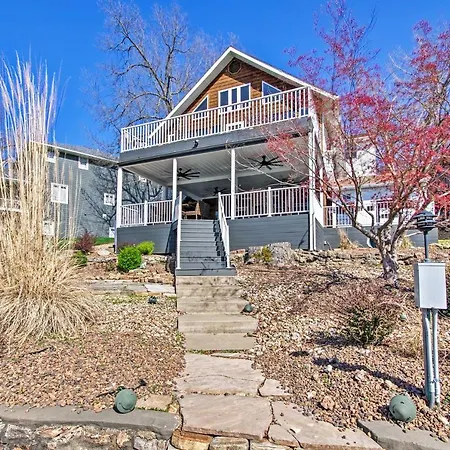 Die einladende Villa Boat Dock And Scenic Decks Lake Of The Ozarks Gem Sunrise Beach verfügt über eine Terrasse mit Grillanlagen und einem Grill.